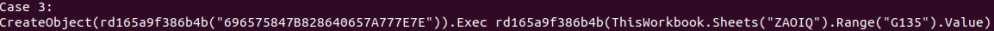 It uses a function rd165a9f386b4b to decrypt the data. Part of of the data is just the object it wants to create and run .Exec from. Part of of the fun is cell-data from the sheet ZAOIQ and Cell G135 (it uses Range, but at one cell) and then extract the value of this cell: