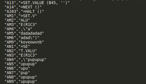 You can see from the cellinfo that the data isn’t encrypted at this stage, it just concatenates strings in the various columns to write them to the sheet. As you can now see, the next step now is to continue running between A14 (NEXT) and A203 (HALT). That will be the code above, so the python interpreter needs to be flexible. The code here has encrypted commands, which are stored in the C1 to C18 cells.
